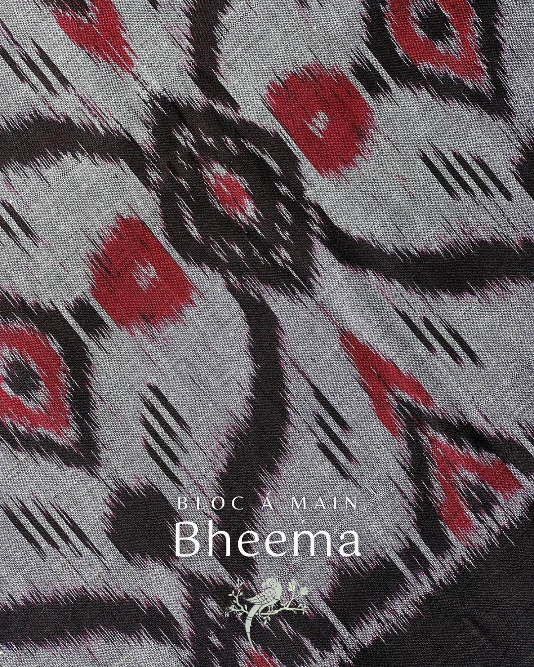 In Bheema Sambhalpuri Ikat, threads—dipped in hues of grey, black, and maroon—are bound in precise patterns before dyeing, then woven so the motifs appear clearly on both sides of the fabric