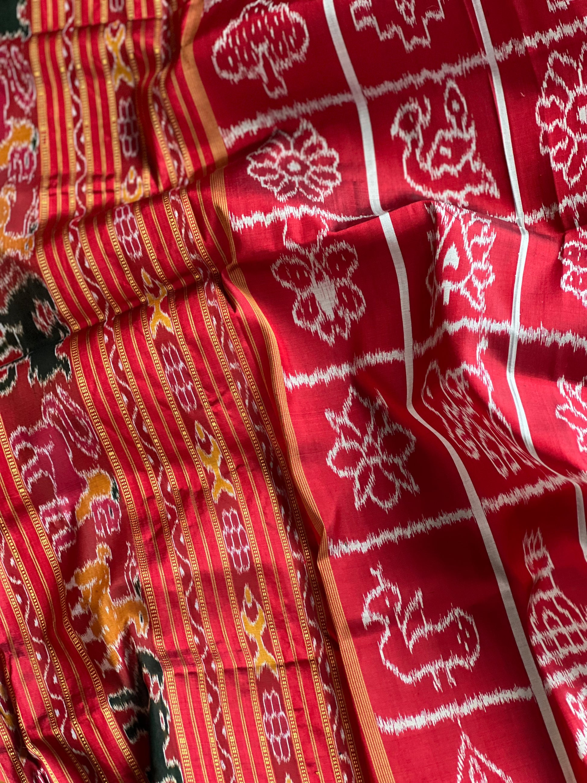 The Nabakothi style is believed to have originated in Odisha’s Nuapatna weaving clusters, often commissioned for temples and royal households. The weavers employed the intricate ikat tie-dye technique, where threads are resist-dyed before weaving, creating geometric precision and living motifs that shimmer with sacred symbolism.