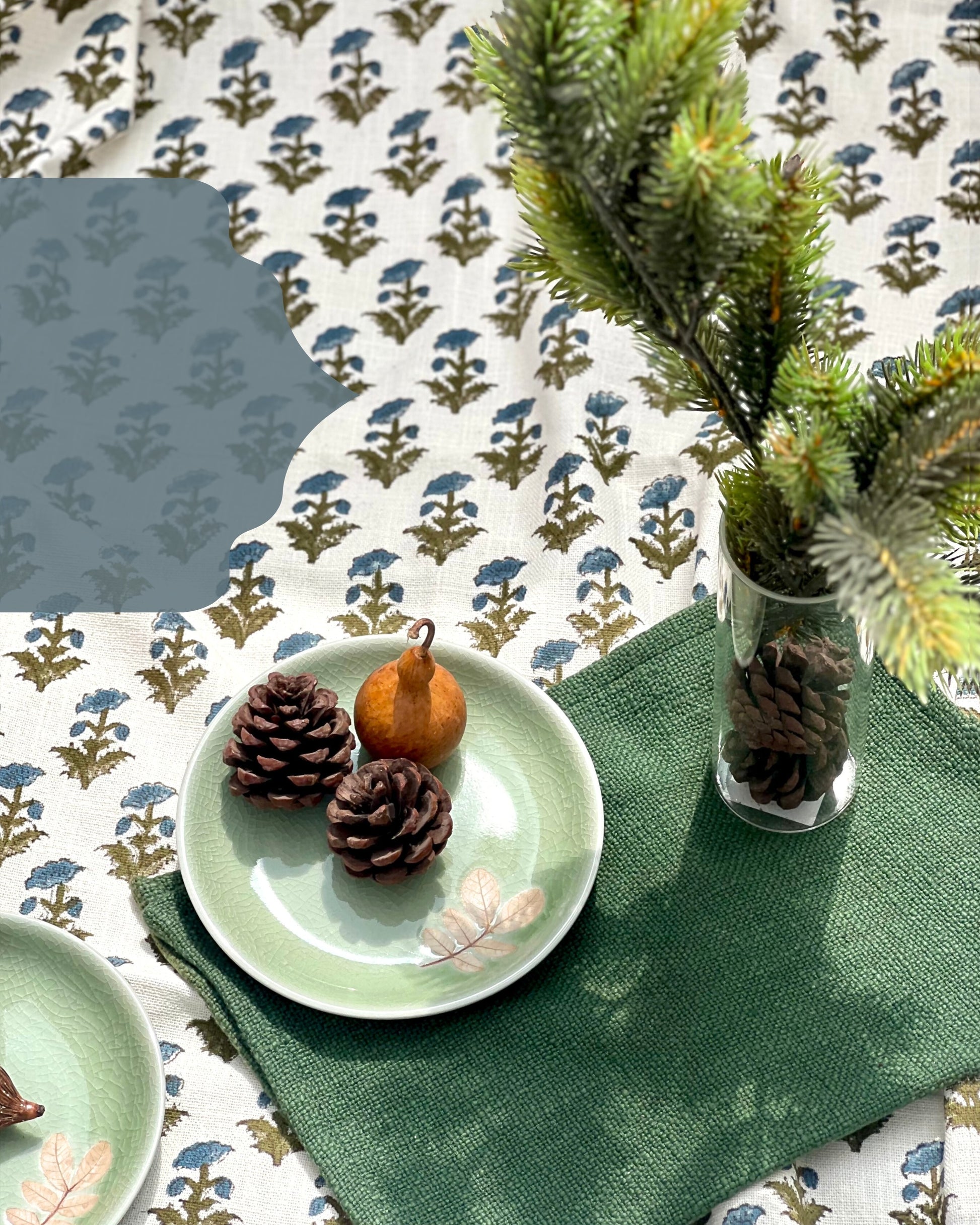 Inspired by the delicate elegance of bluebells swaying in a summer breeze, our Nargis Handwoven Cotton TNT Table Cover is a true work of art. Intricately hand-blocked with the most exquisite bluebells and olive leaves, this table cover creates an enchanting tablescape that exudes both depth and warmth. Set against a soft ecru base, the floral motif comes to life, making every meal feel like a celebration of beauty and craftsmanship.